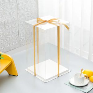 Đế là giấy ivory cán màng pp bọc ngoài (an toàn thực phẩm), bên trong carton cứng và chắc chắn để bánh trực tiếp, thân nhựa PET có màng nilon chống trầy xước, khi sử dụng bóc lớp màng ra, thân trong suốt